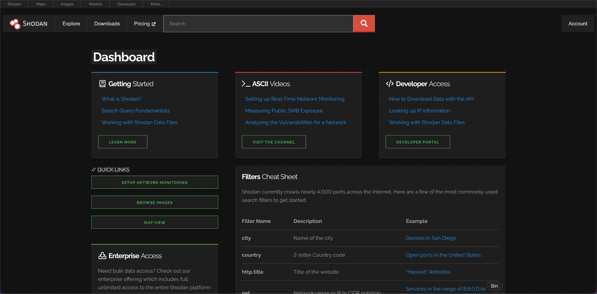 The real power of Shodan comes from using filters. Filters are special commands that narrow down your search. With a free account, you can use these to get very specific results.