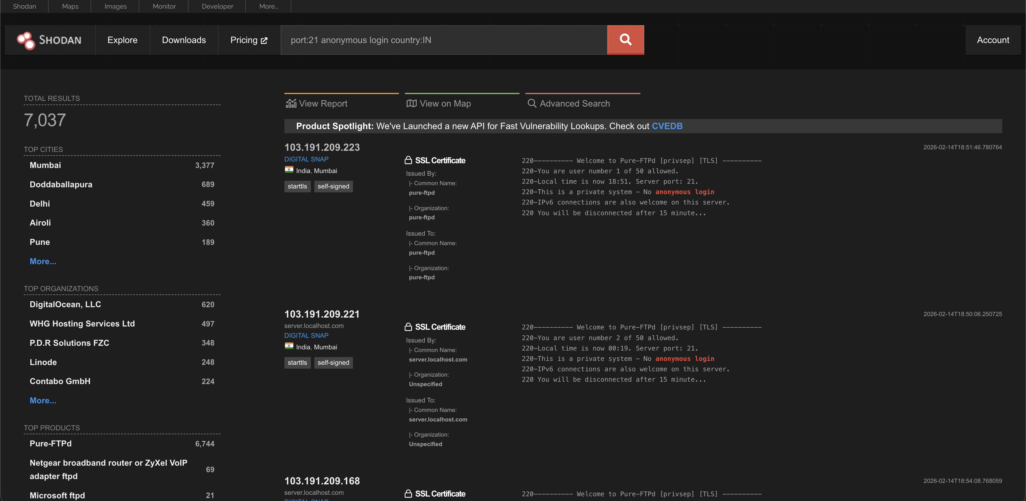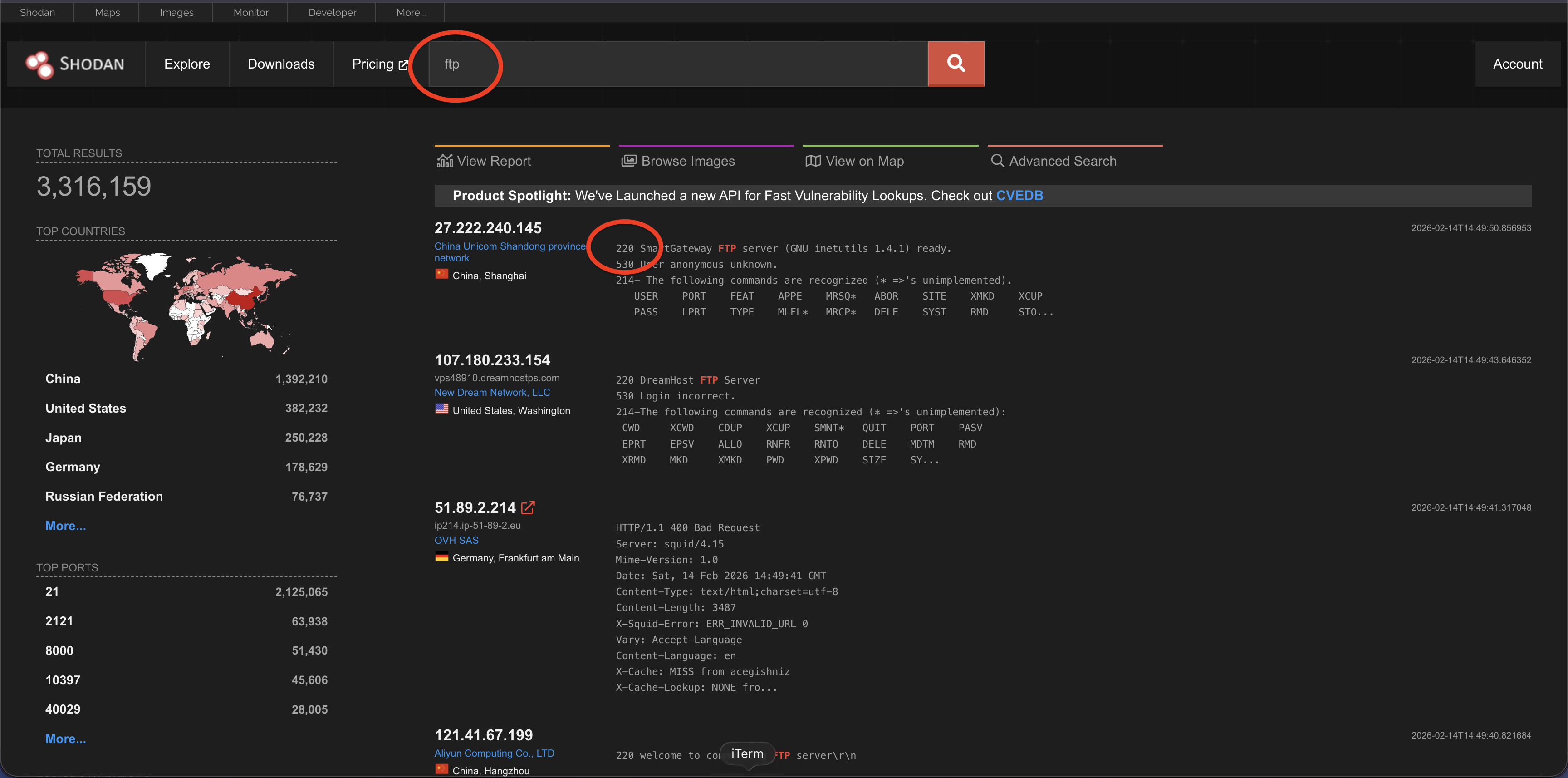 Type FTP into the search bar. You will see a list of IP addresses that have port 21 open. You might see “220” in the banner, which is a standard FTP welcome code.