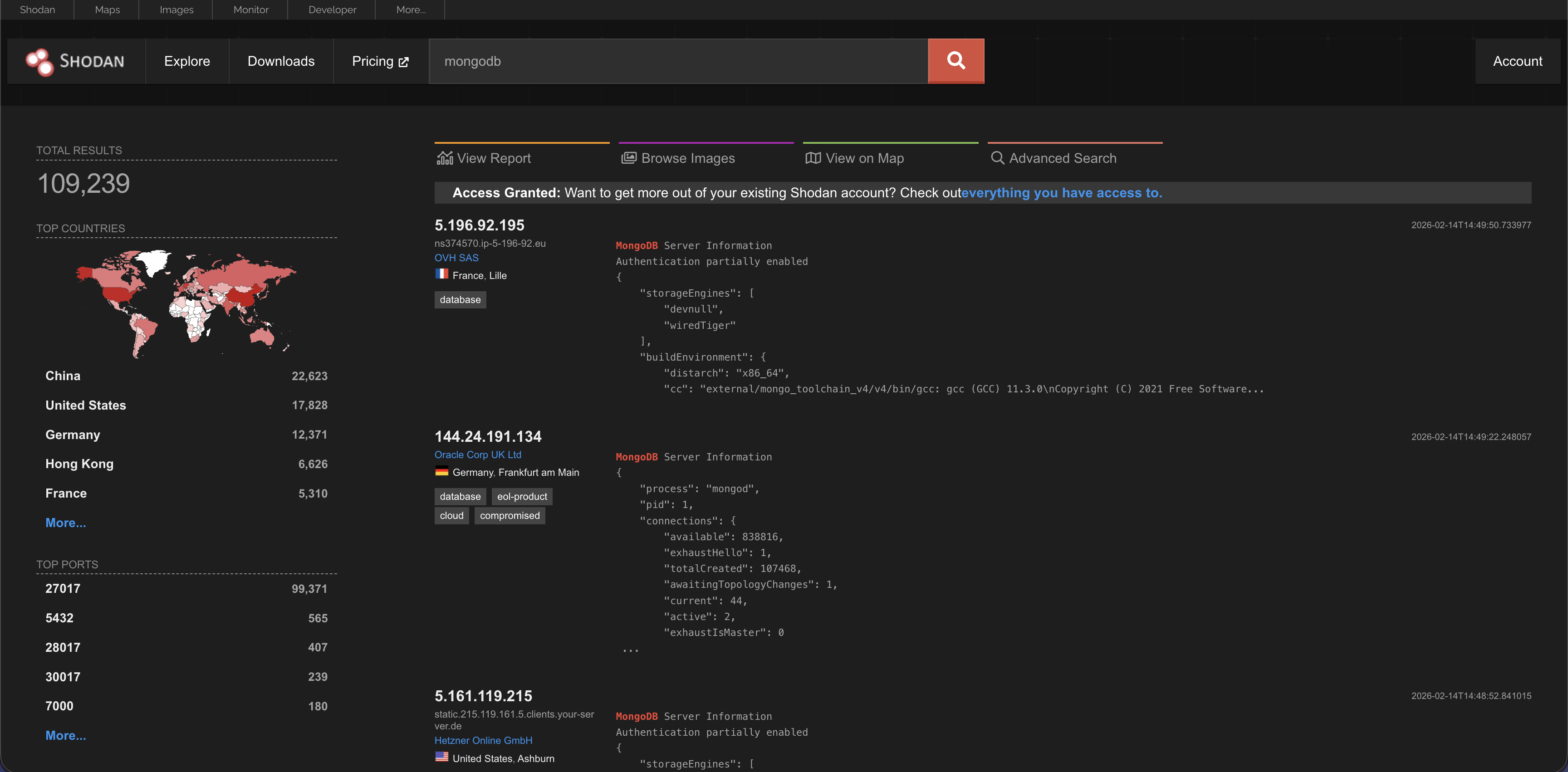 Search Query: “MongoDB Server Information” port:27017 -authentication