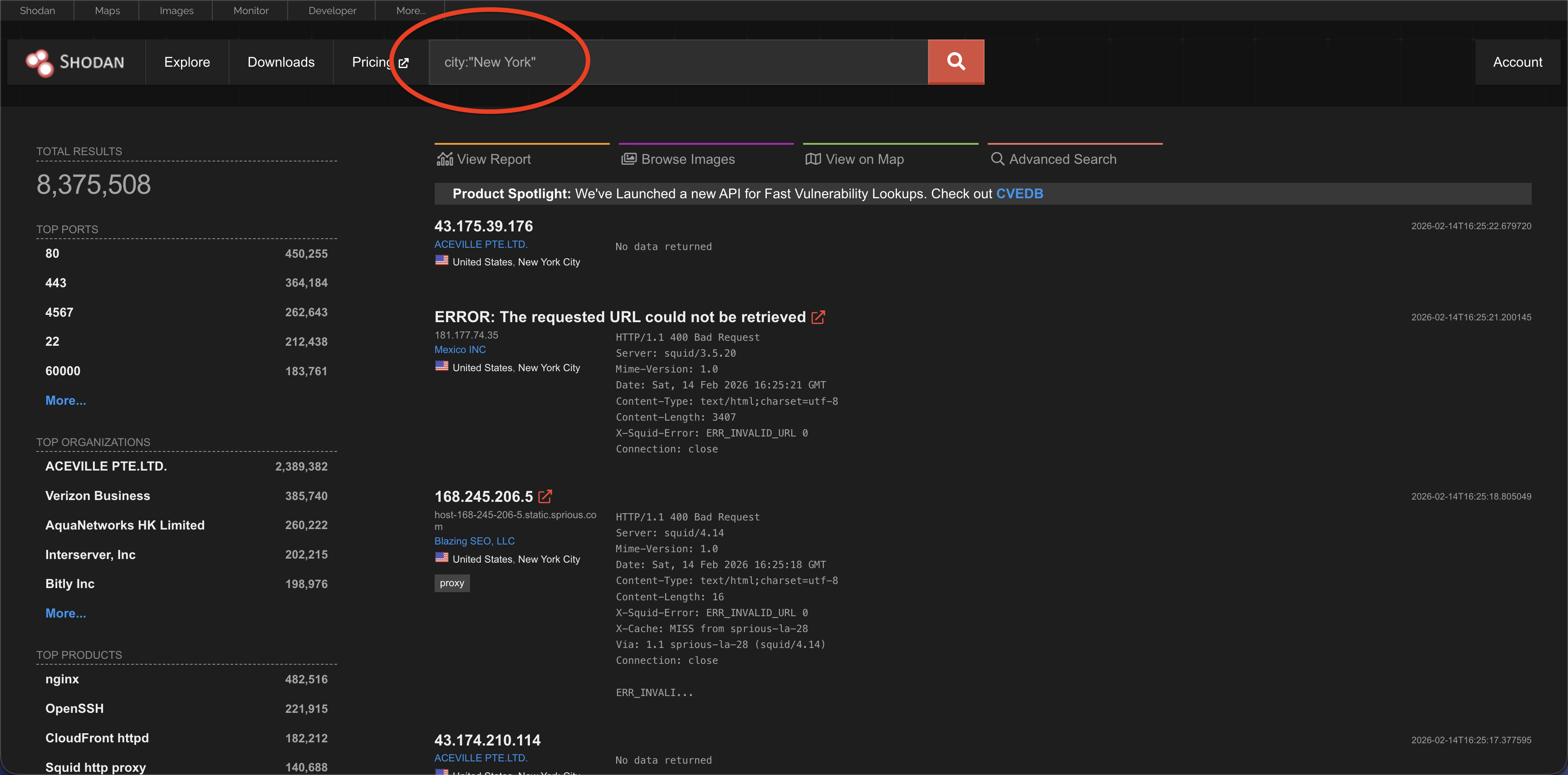 If you want to see what the internet sees of your home network, find your public IP address (by Googling “what is my ip”) and put it into the Shodan search bar. You might be surprised to see which of your devices are actually public.