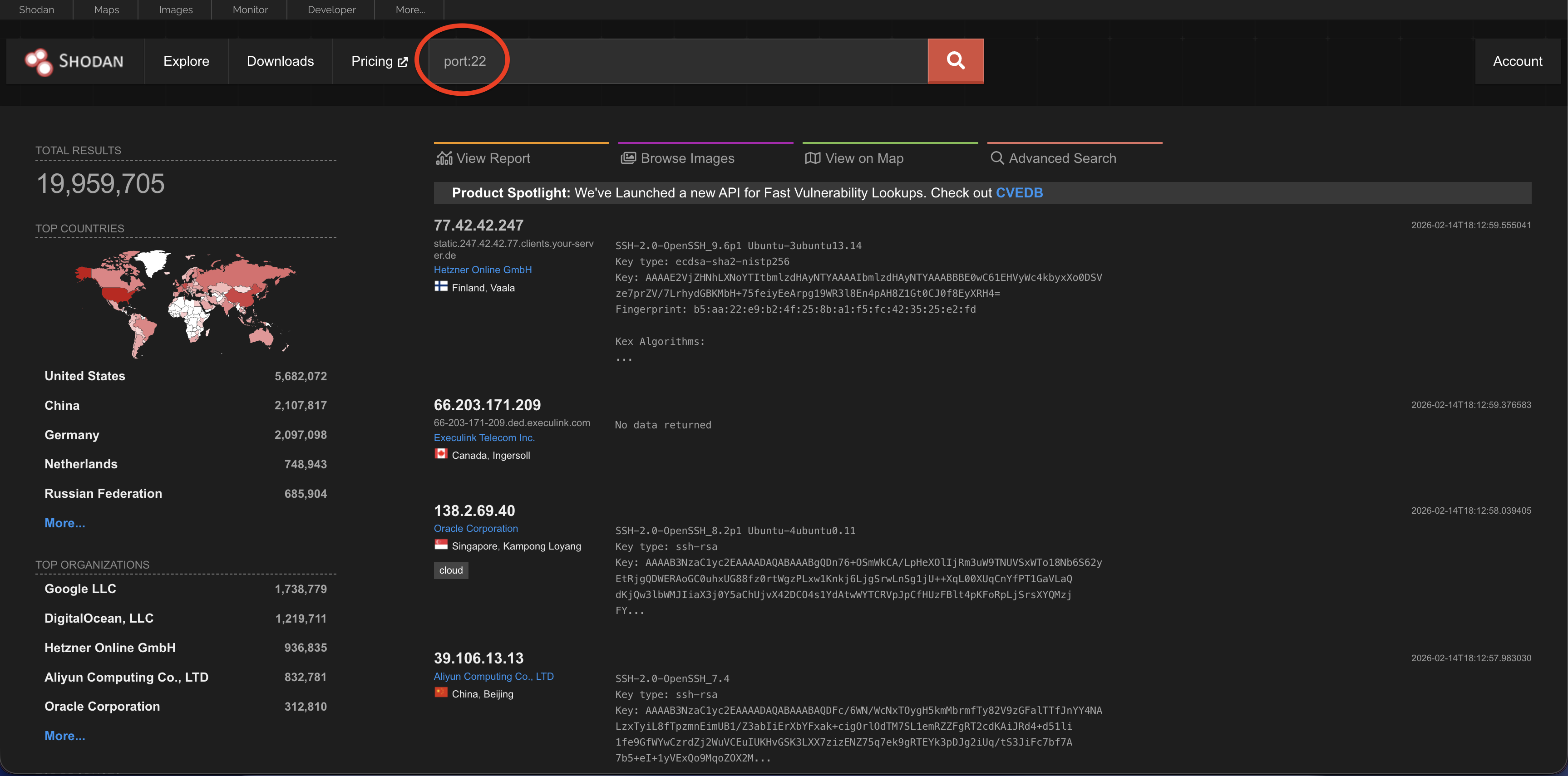 This looks for a specific open port. For example: port:22 finds devices with SSH (Secure Shell) access.