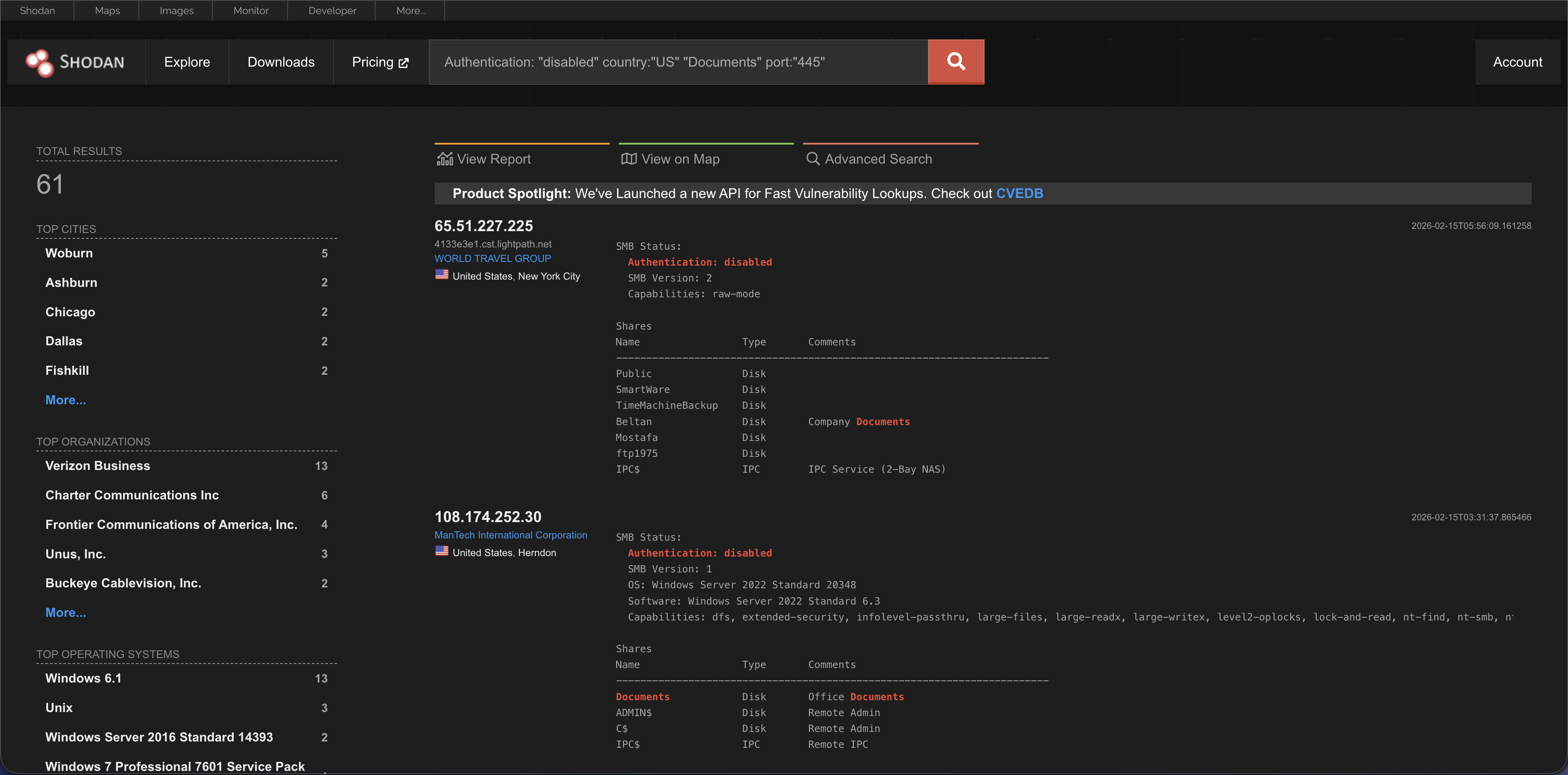We can refine our Shodan search by combining multiple filters. In this case, the query targets systems with port 445 open (indicating SMB), authentication disabled, located in US, and containing the keyword “Documents.” Using these filters together helps isolate devices that match very specific conditions.