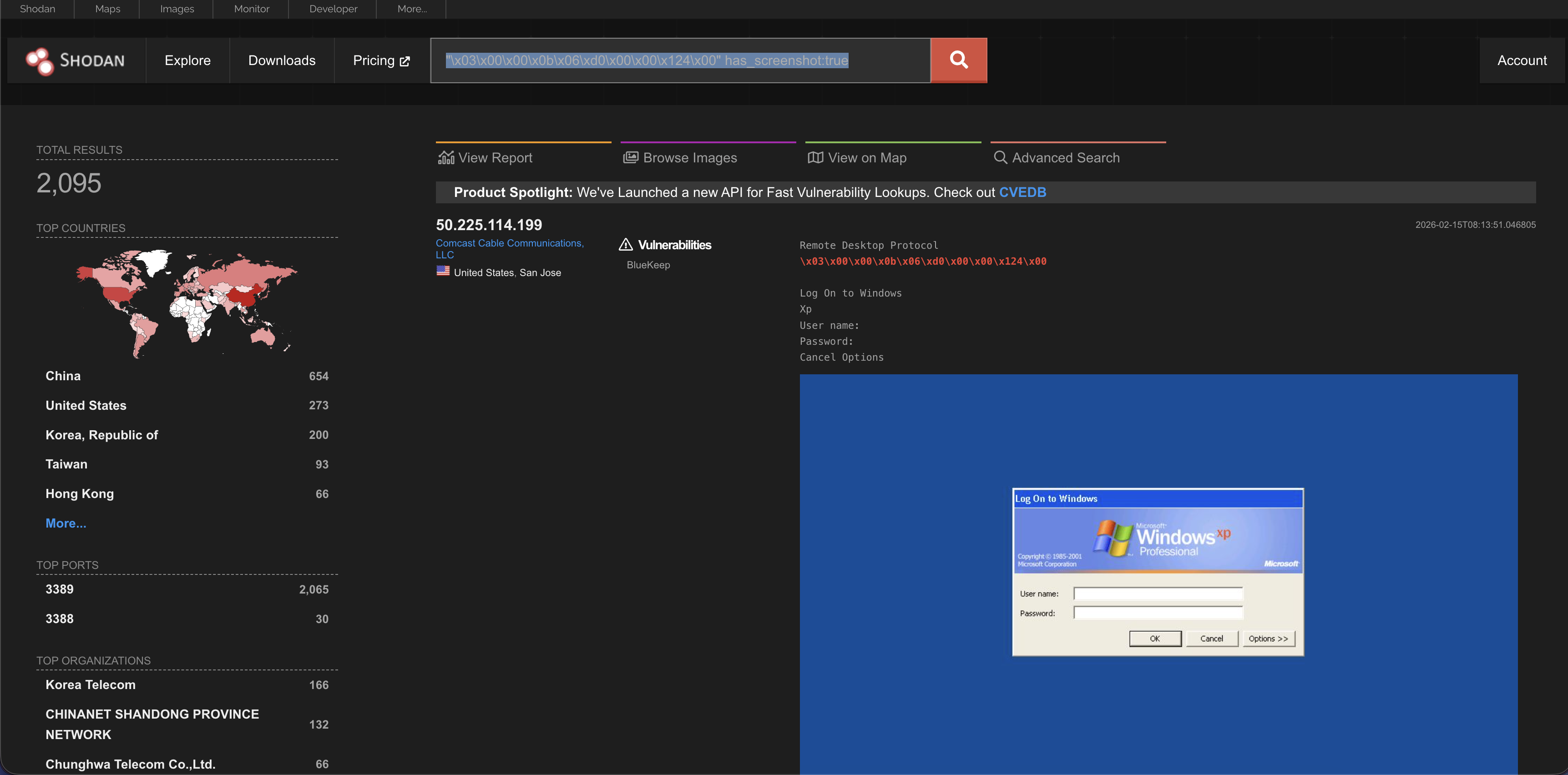 To check whether Windows Remote Desktop (RDP) is exposed, we can build a targeted Shodan query. This approach is useful during client assessments to verify if RDP is enabled and to review any additional details Shodan has collected.