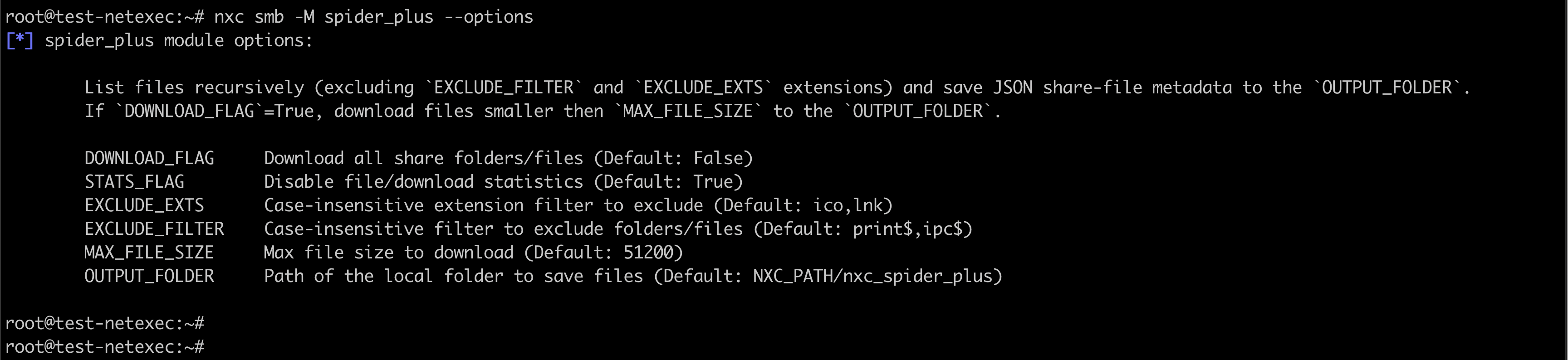 - Settings – Control how NetExec runs. Common settings include: