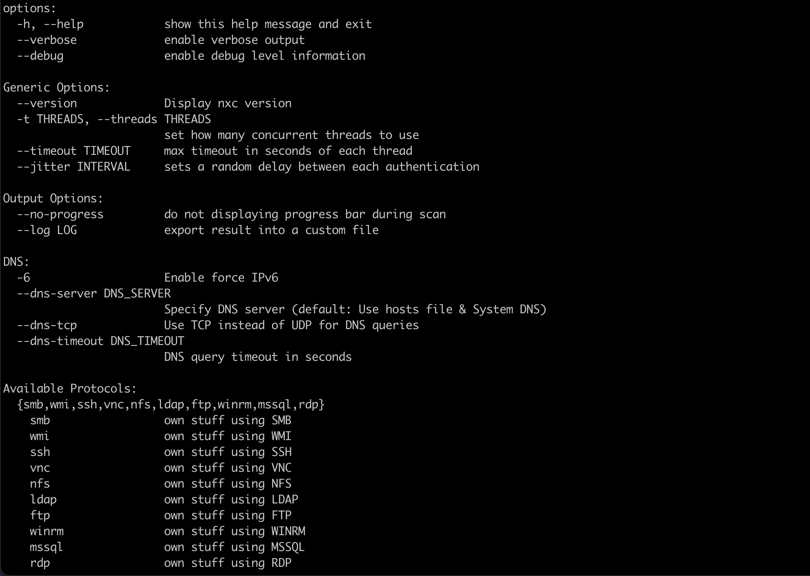Every NetExec command follows a consistent structure. Once you understand this pattern, creating your own commands becomes much easier.