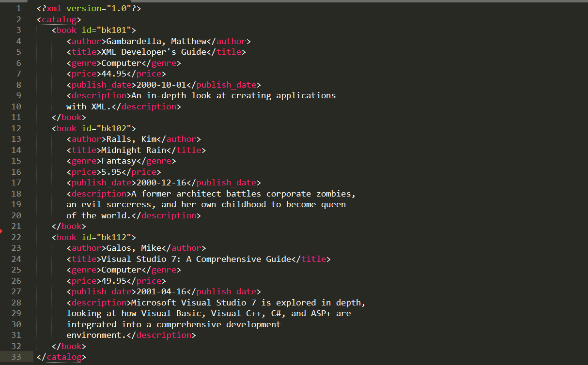 XML doesn’t have its pre-defined tags like HTML, so we use our own tags to describe the data or whatever information we have. In the above document, we have different tags i.e, book id, author of the book, title of the book, price of the book, publishing date of the book, and the description of the book. All of this information is human readable and when a normal person reads it, he can easily tell what this information is about. That is what XML is designed to do i.e, storing and transporting information in a meaningful way. It is called Extensive Markup Language which means that we can create tags with the names we want so that it would present the data as meaningfully as possible. Unlike the HTML which has its own tags, XML is not used to display the information it stores, there is Javascript, CSS and HTML for that functionality